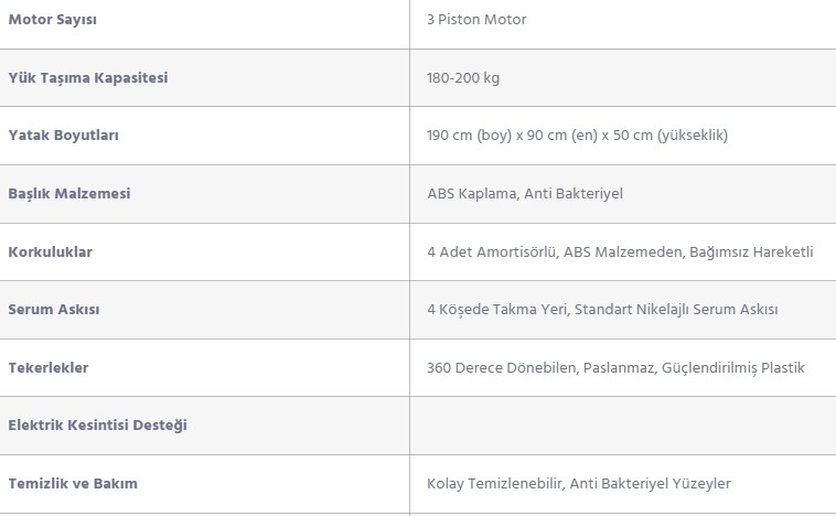 3 motorlu hasta yatağı, hasta bakımı sırasında hem hastanın hem de bakım veren kişinin ihtiyaçlarına mükemmel bir şekilde cevap verir. Kaliteli malzemeleri ve gelişmiş teknolojisi sayesinde bu hasta yatağı, uzun yıllar boyunca güvenle kullanılabilir. Hem evde hem de profesyonel sağlık ortamlarında tercih edilebilecek bu ürün, yüksek taşıma kapasitesi, ergonomik tasarımı ve hijyenik özellikleriyle öne çıkar.